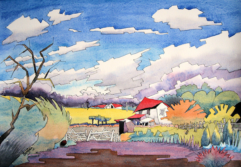 | After the Storm Over Rape Field. 305 x 210 mm watercolour and pen. |